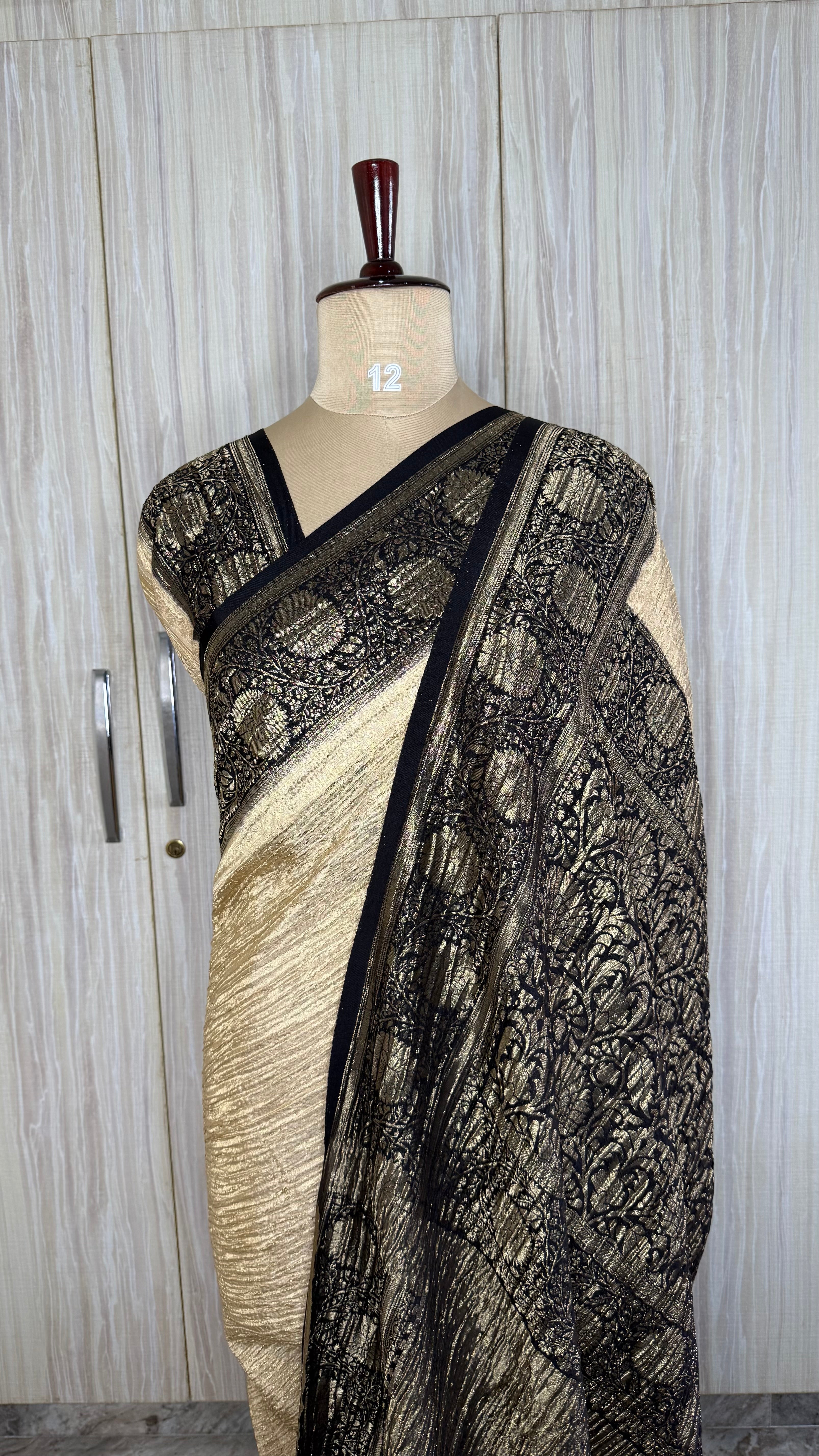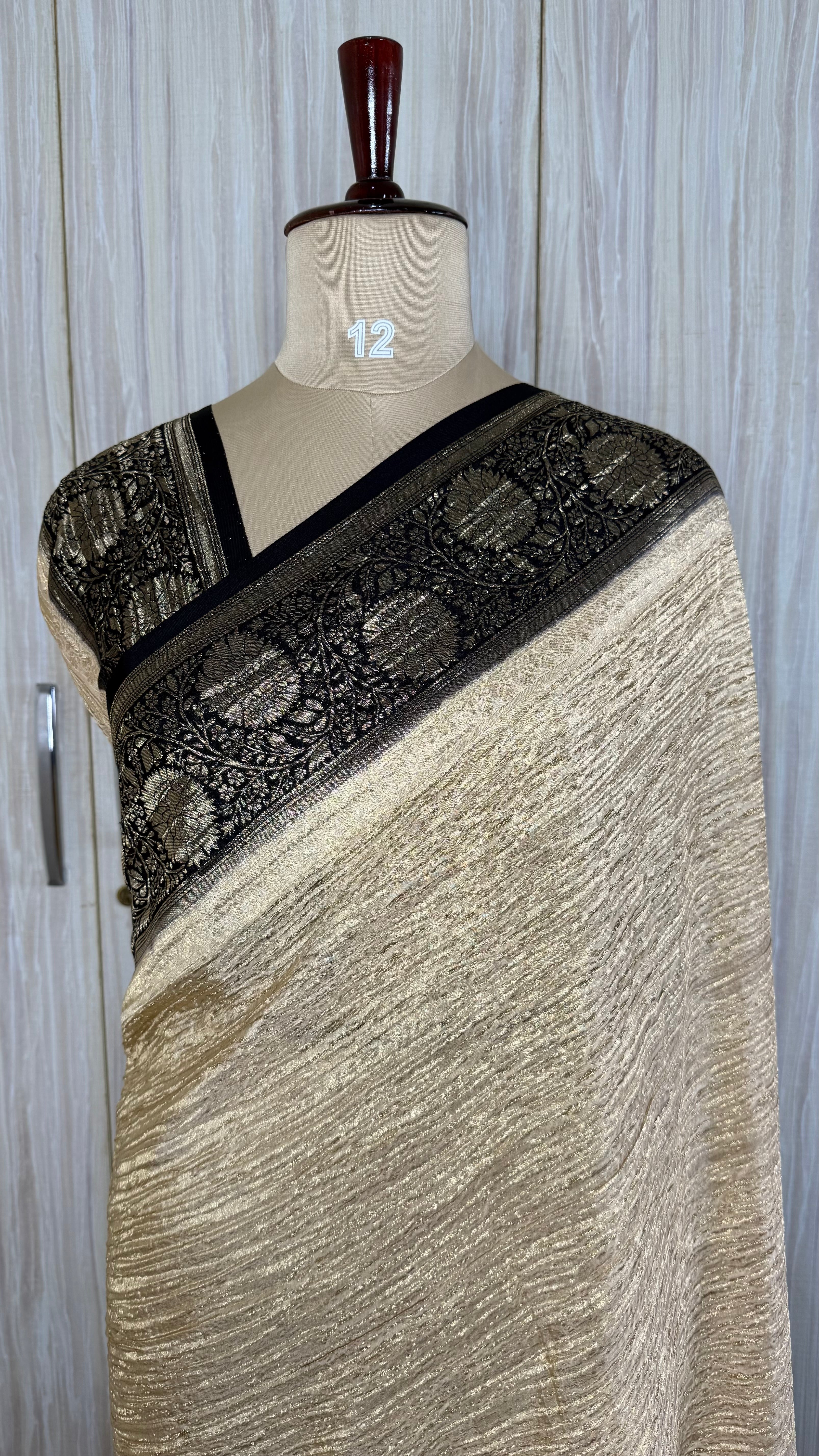 Elegant cream and black crush tissue saree with a glossy, luxurious drape — lightweight, chic, and perfect for festive or evening wear.