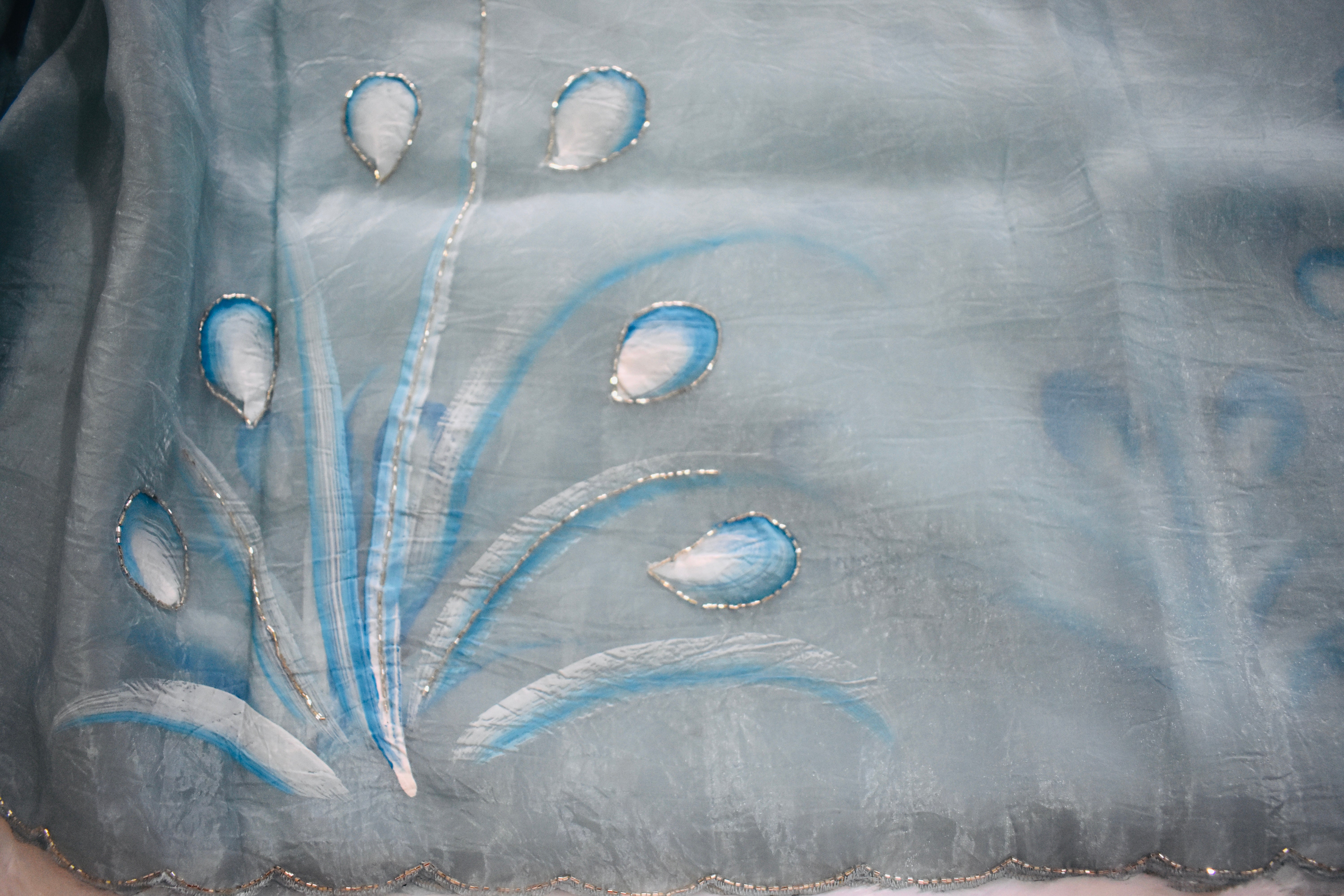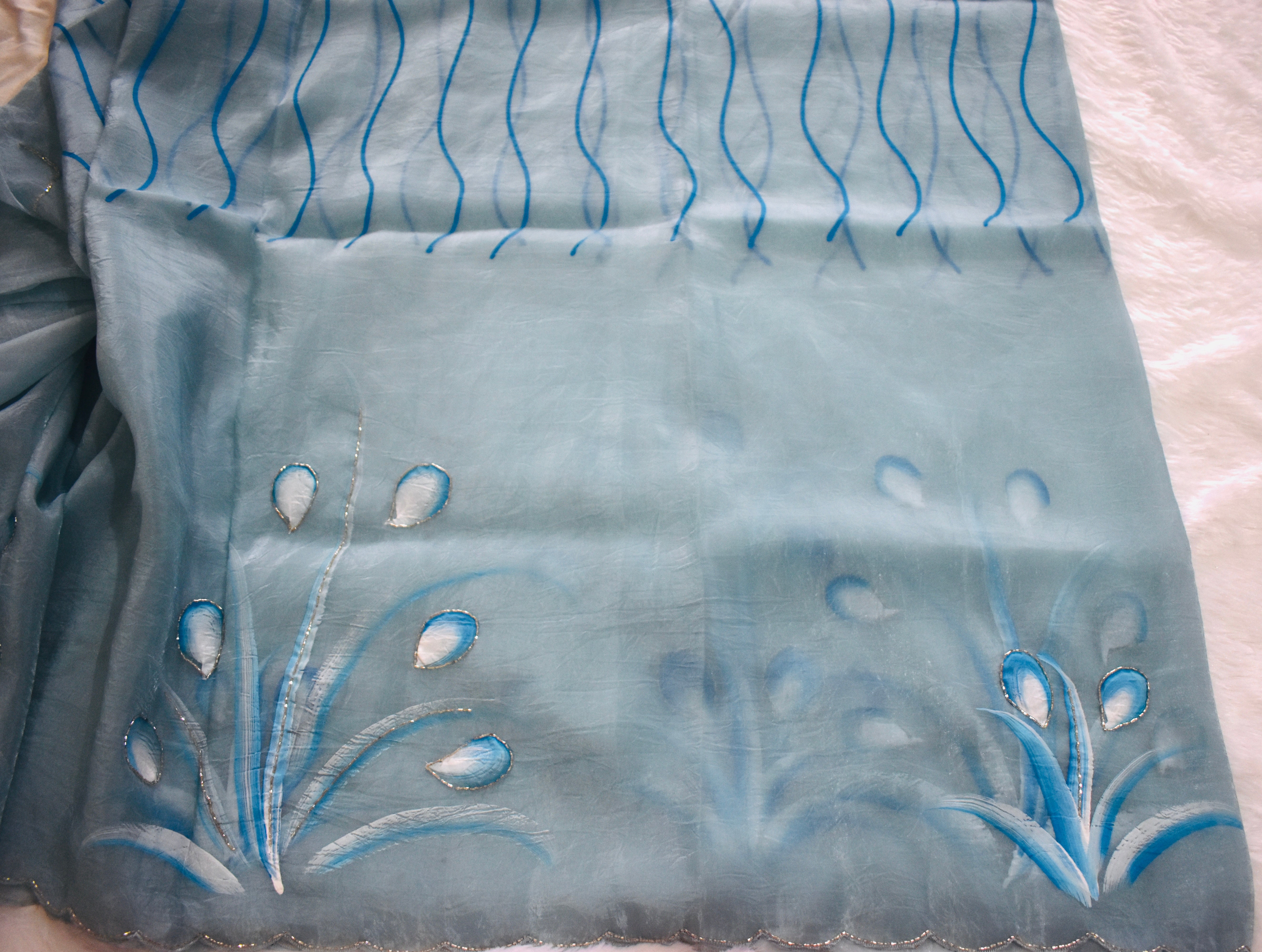 Crush tissue saree, featuring exquisite hand-painted motifs paired with intricate Aari Work and scallop border.