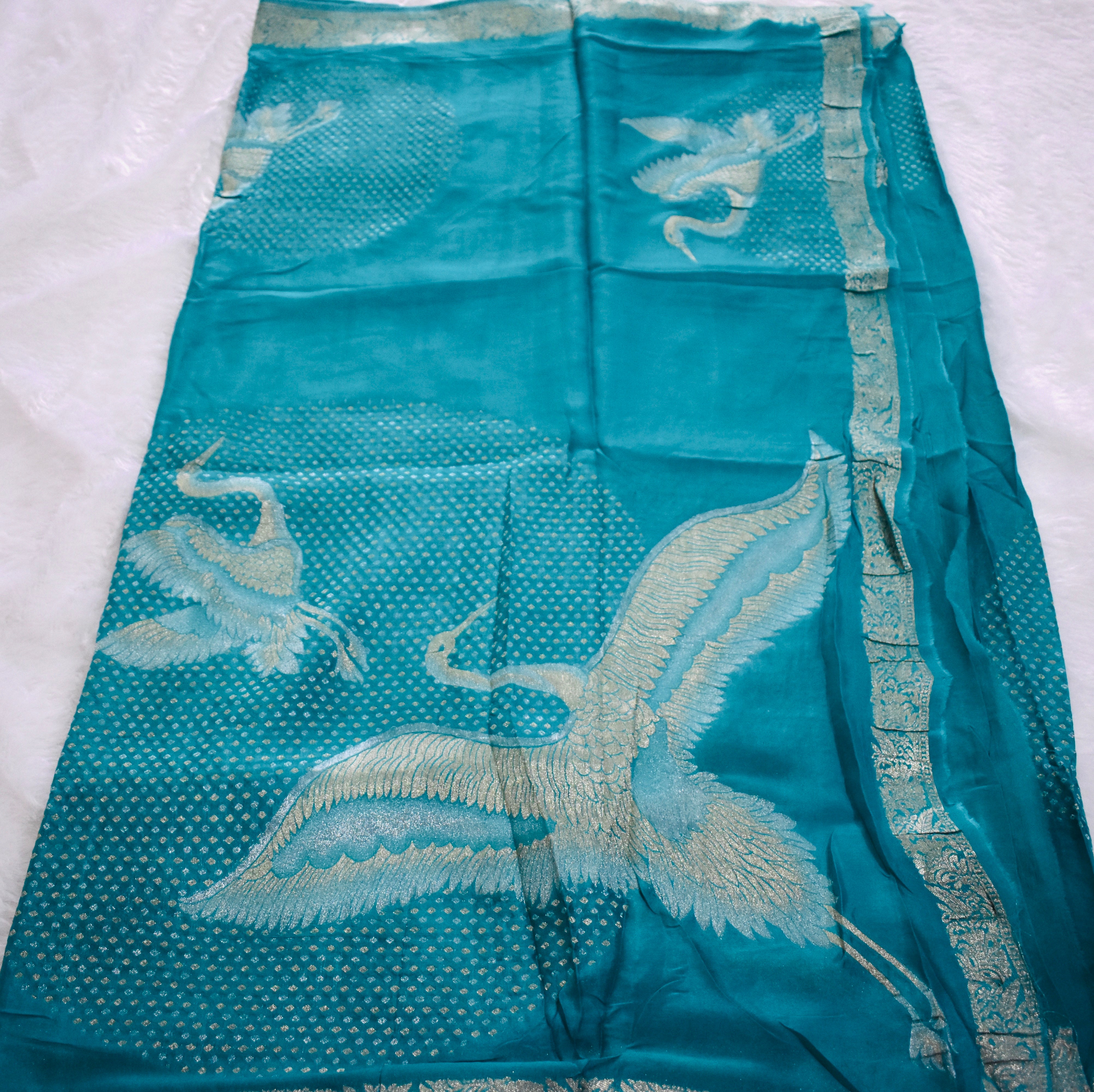 Soft Chinnon crepe saree, featuring a striking eagle design that symbolizes power and grace.